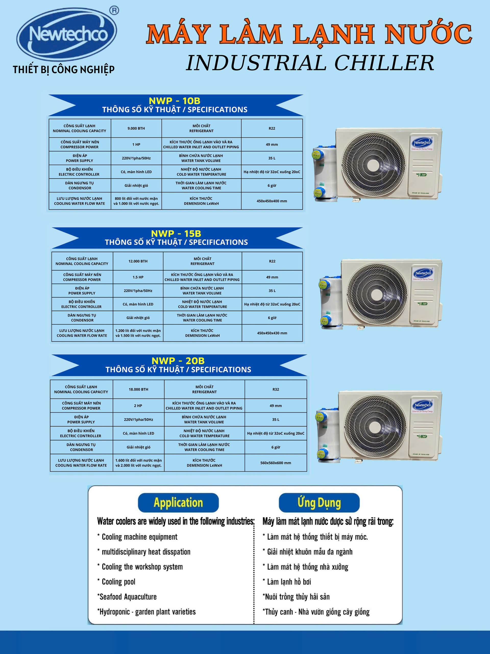 Hệ thống điều hòa trung tâm chiller của NEWTECHCO được ứng dụng rộng rãi trong các tòa nhà, trung tâm thương mại, nhà máy và khu công nghiệp – nơi yêu cầu công suất lạnh lớn và vận hành ổn định, tiết kiệm điện năng.
